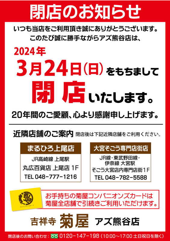 アズ熊谷の2Fにある「吉祥寺菊屋アズ熊谷店」が閉店するみたいです。