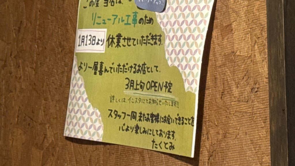 1月12日まで通常通り営業し、1月13日からリニューアルのため改装工事を行うそうです。