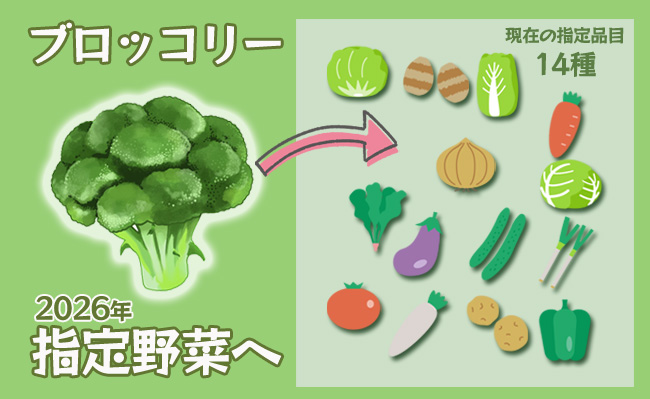 現在、キャベツ、きゅうり、さといも、だいこん、たまねぎ、トマト、なす、にんじん、ねぎ、はくさい、ばれいしょ、ピーマン、ほうれんそう、レタスの14品目が指定されています。
