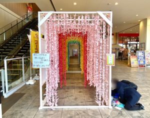▲駅舎の外に飾られている手形桜は、神川町立丹荘小学校ハッピーフラワープロジェクトの一環で作製したもので、城峯(じょうみね)公園のフユザクラをモチーフにしているとのこと😀