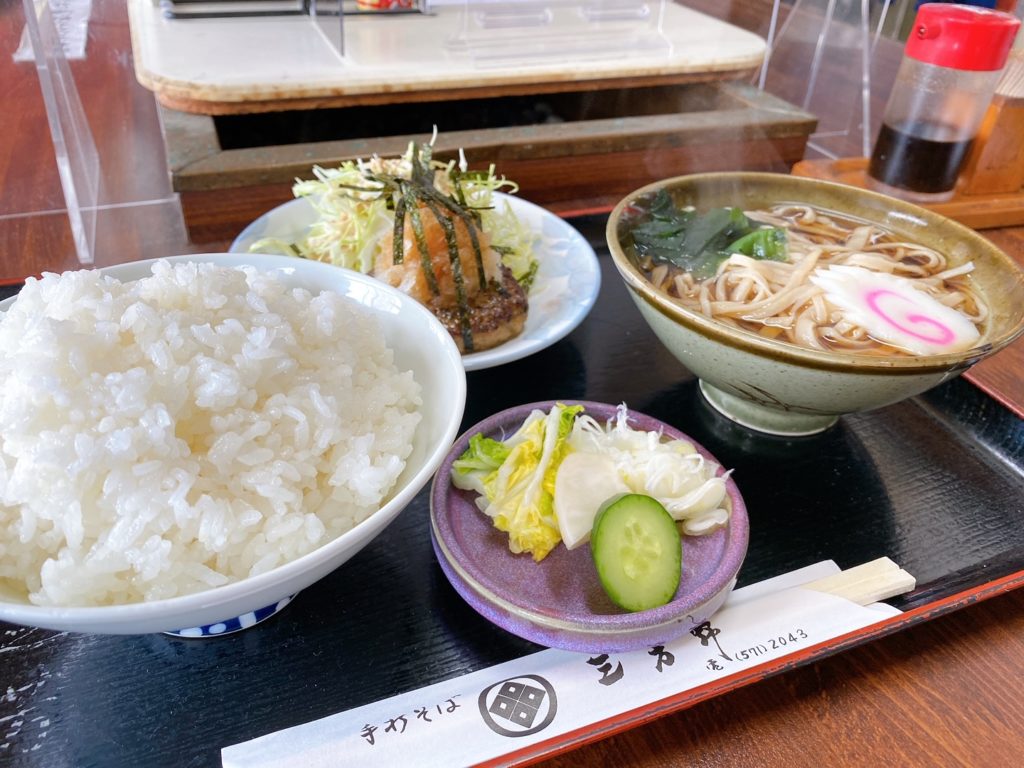 ▲「ごはん」「おろしハンバーグ」「そばorうどん)」「お新香」というセット内容