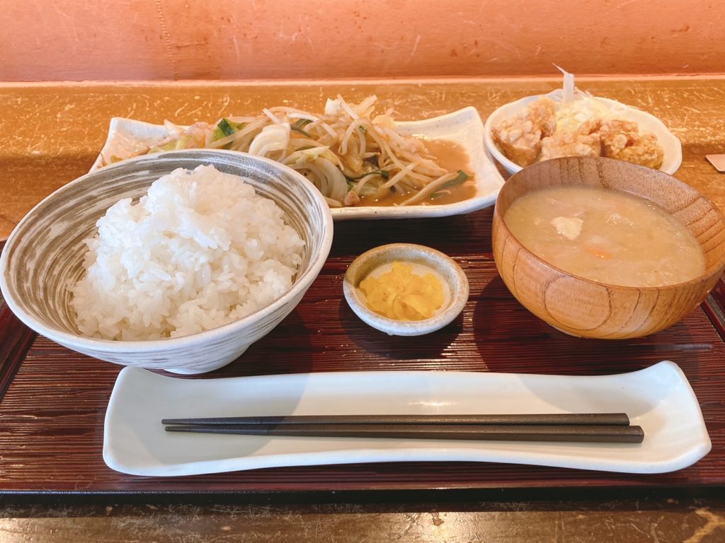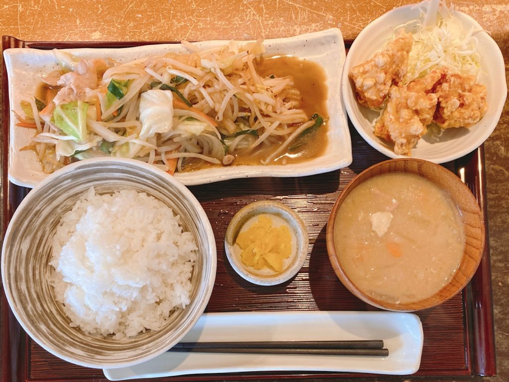 ▲ご飯、野菜炒め、唐揚げ、豚汁、漬物というセット内容