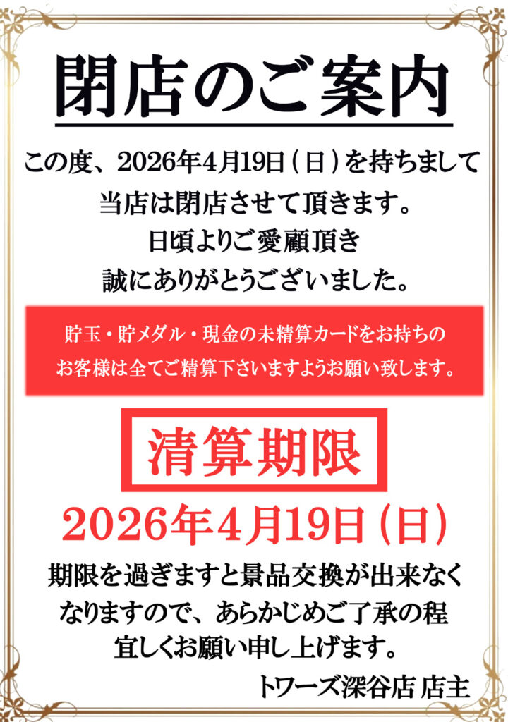 深谷市上原にあるパチンコ店「トワーズ深谷店」が閉店するみたいです。