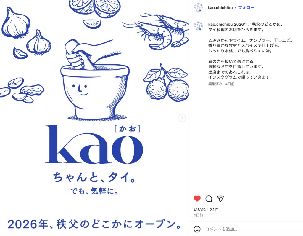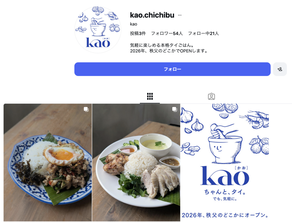 “秩父のどこか”にタイ料理のお店「kao(カオ)」がオープンするみたいです。