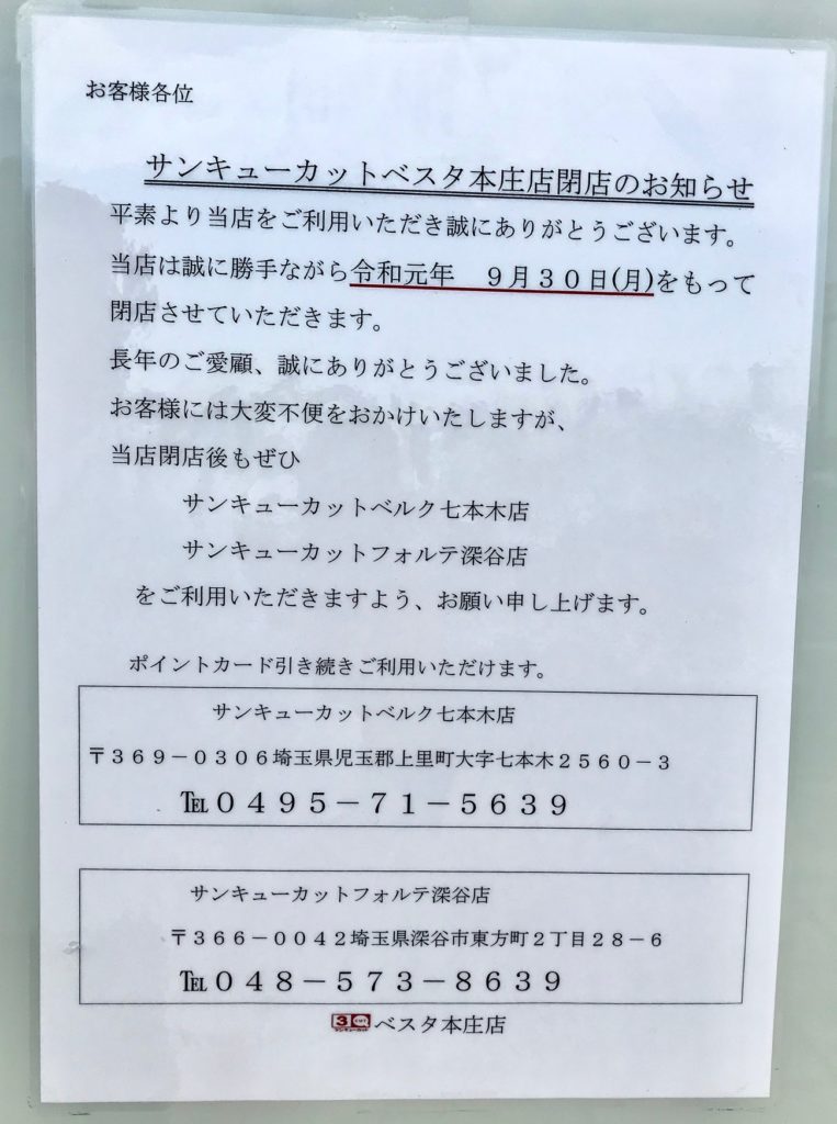 本庄市寿にあった「サンキューカットベスタ本庄店」が閉店していました。