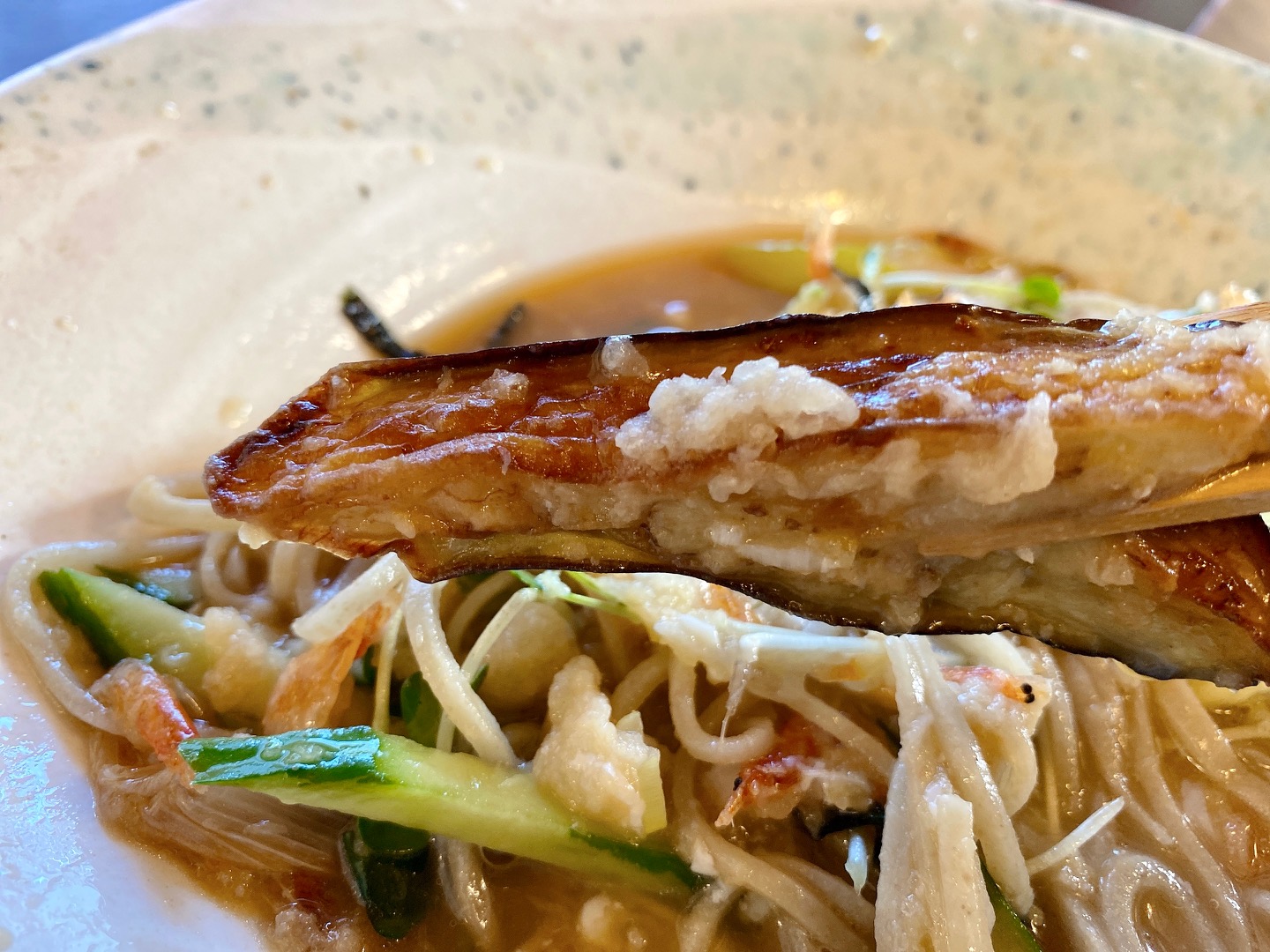 ▲こだわりの手打そばの上に、地元野菜の「ナス」「キュウリ」「長ネギ」と揚げたての「桜えび」、大白胡麻油と綿実油で揚げた「揚げ玉」、大根おろし・きざみ海苔がトッピングされています😀
