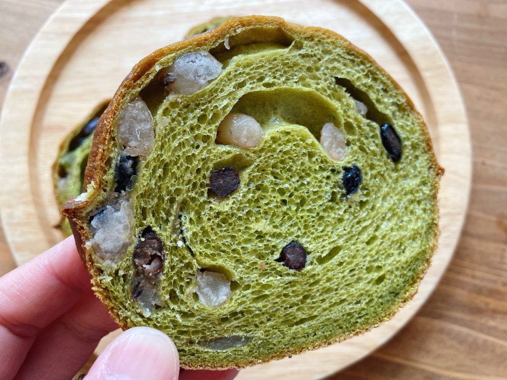 春の新作パンで、宇治抹茶を練り込んだ生地で五色豆を巻き込み、丸太の形で焼き込んだパン✨