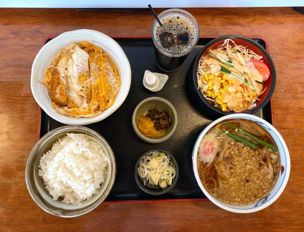 ▲内容は「ごはん」「カツ煮」「温うどん」「サラダ」「漬物」