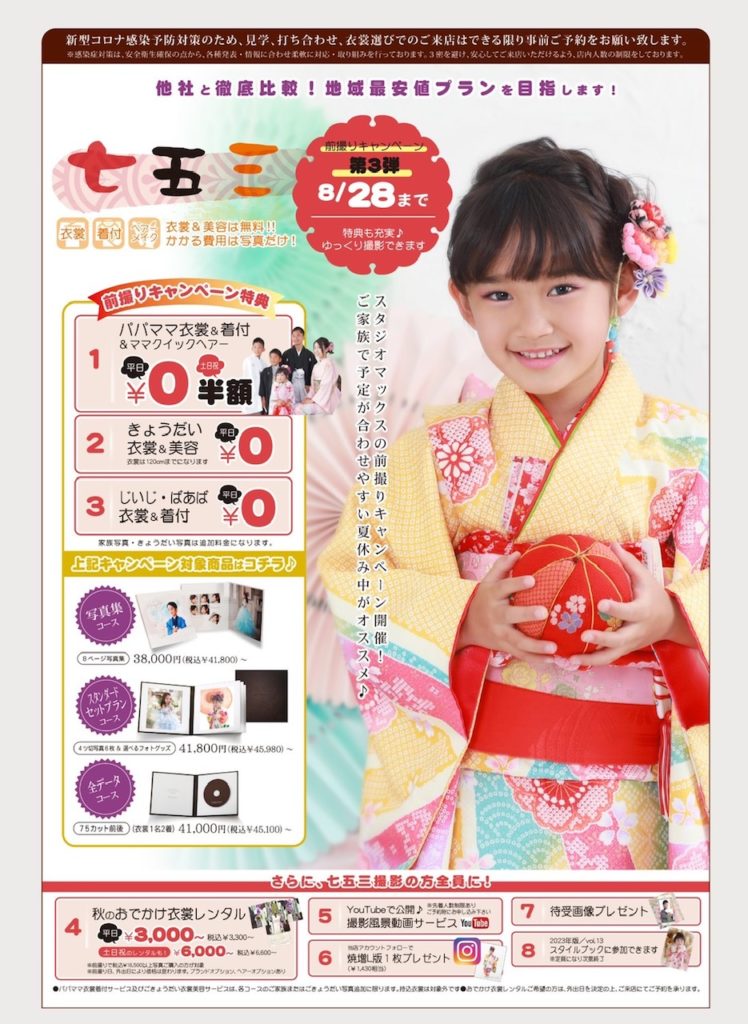 深谷市・上尾市・群馬県太田市にあるフォトスタジオ「スタジオマックス」では、毎年恒例の『七五三早撮り(前撮り)キャンペーン』を開催中です✨