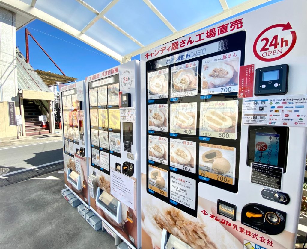 ▲この自販機は定番商品の「キャンディ屋さんの豚まん」のみの販売となっています。(2022年11月現在)
