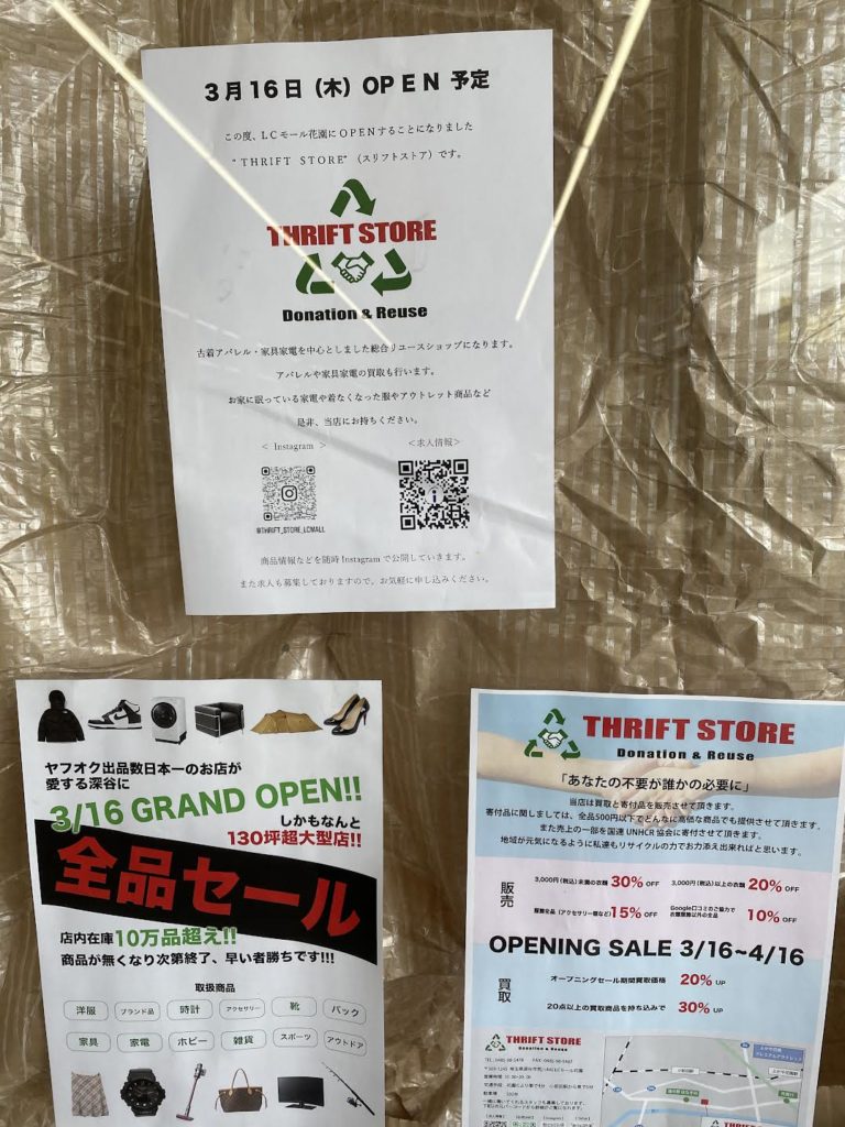深谷市荒川のLCモール内に「THRIFT STORE(スリフトストア)」っていうリユースショップがオープンするみたいです。
