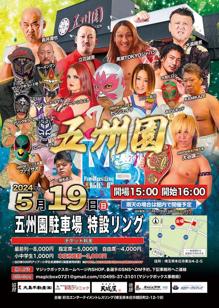 本庄市東台にある「五州園」 駐車場特設リング で、地域密着型エンターテイメントプロレスリング『MAGIC BOX(マジックボックス)』の興行が開催されます😸