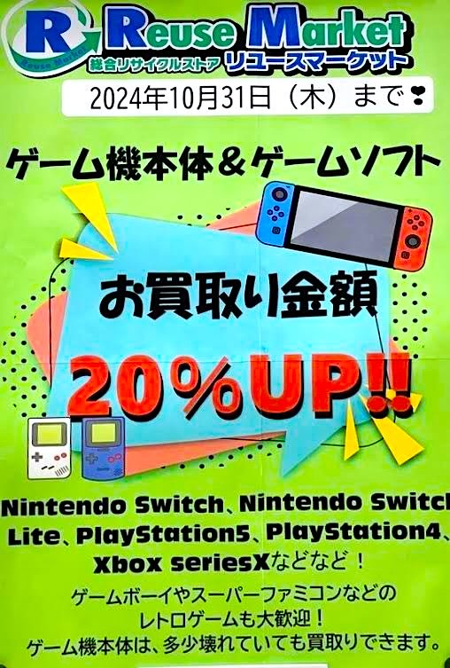 本庄市にある総合リサイクルストア「リユースマーケット」が、2024年10月31日(木)まで秋の特別イベント『ゲーム機本体&ゲームソフト強化買取キャンペーン』を開催しています😸