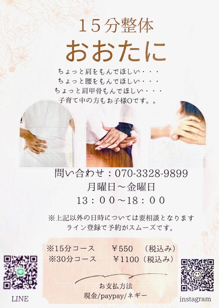 そんな方は是非一度、「15分整体おおたに」までお越しください✨