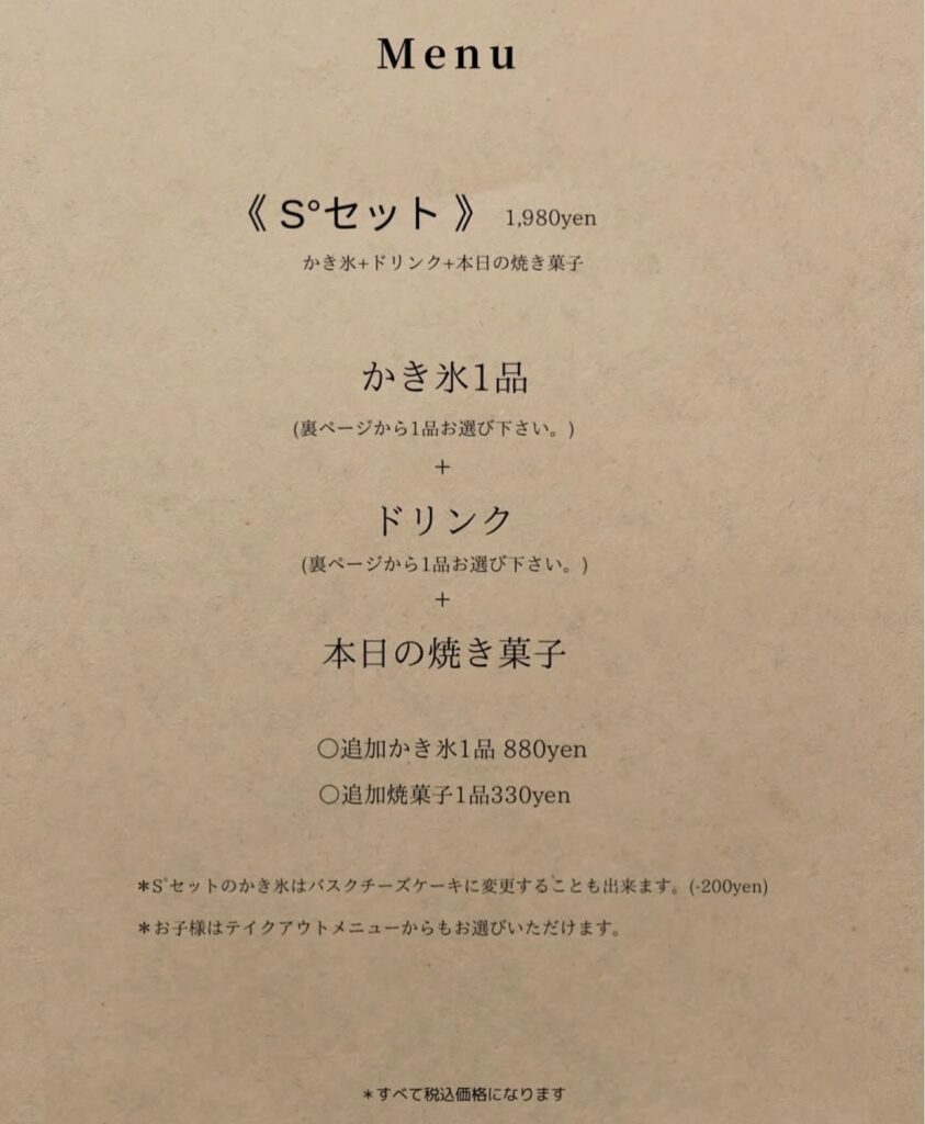 ※イートインの場合は「S°(エスド)セット 1,980円(税込)[かき氷+ドリンク+本日の焼き菓子]」のみとなります。