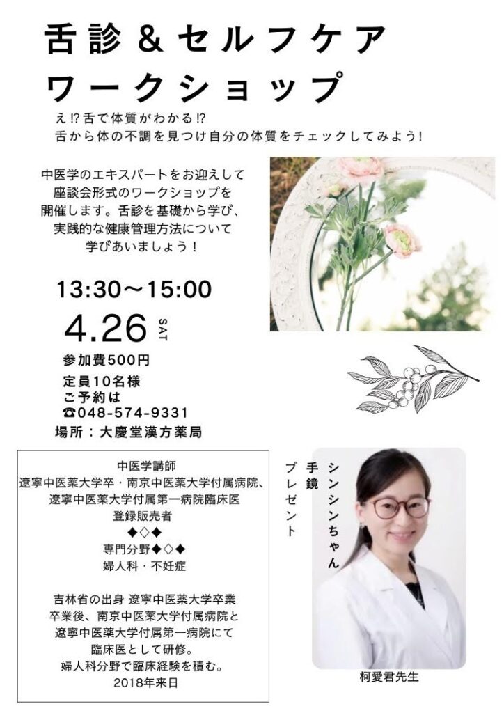 中医学のエキスパート!「柯愛君」先生をお呼びして、舌診を基礎から学び、自分の体質を把握し、実践的な健康管理方法を学べる定員10名様のワークショップを開催します😸