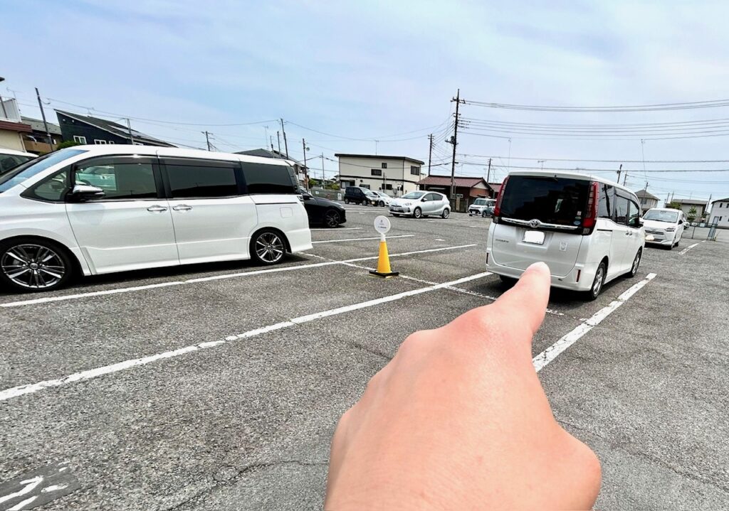 ▲店舗向かい・写真右の白い車が駐車している場所が契約駐車場です。