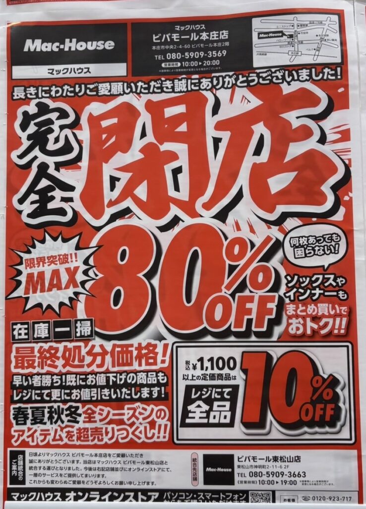 本庄市中央にある「マックハウス ビバモール本庄店」が閉店するみたい。