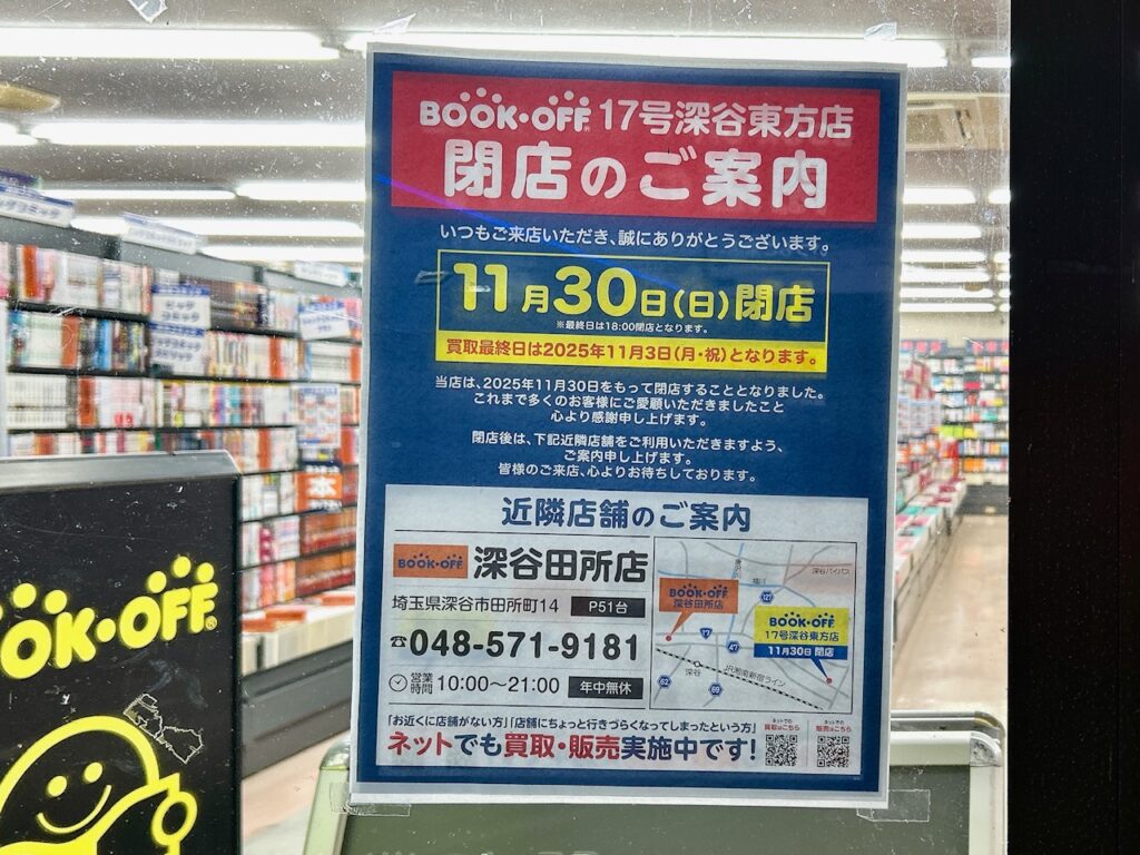 深谷市東方町にある「ブックオフ 17号深谷東方店」が閉店するみたいです。