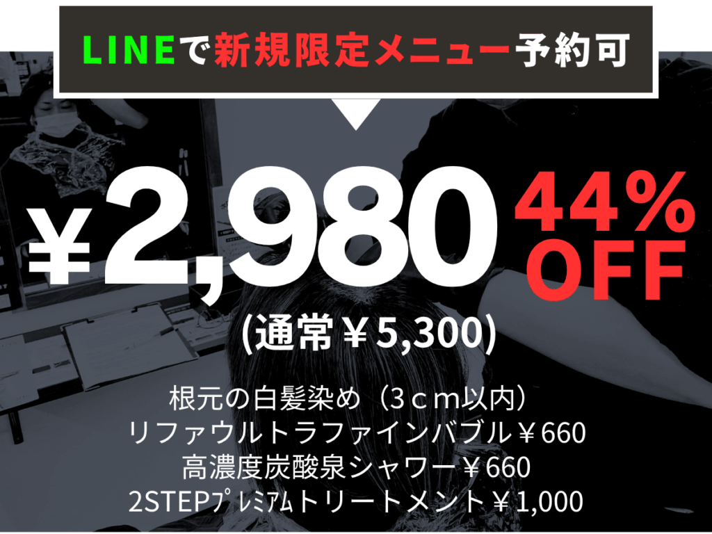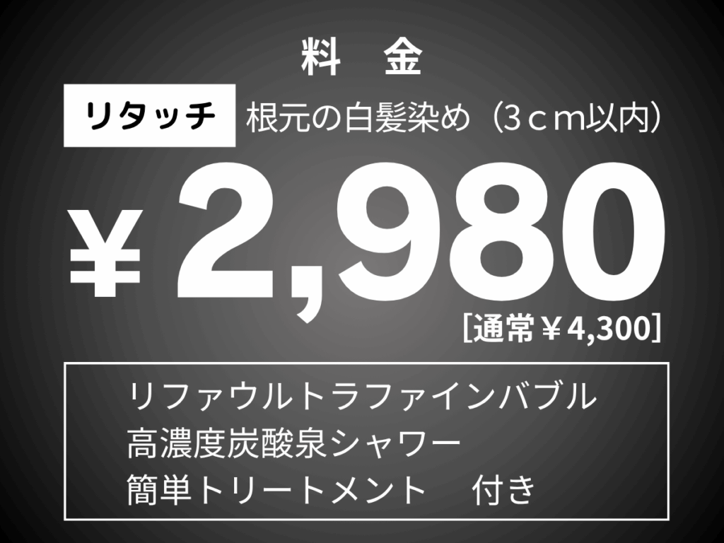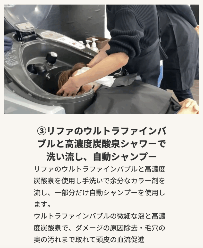 カラー剤は「ホーユー社」の最新のものを使用しており、また、わずか10分の放置時間と高濃度炭酸泉の効果で髪と頭皮、体へのダメージが最小限に抑えた施術を受けられます。