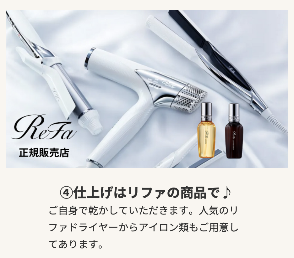 シャンプーは、高濃度炭酸泉を使用し、さらにセルフブローでは、美髪に導くと人気のリファ最新商品をご用意!