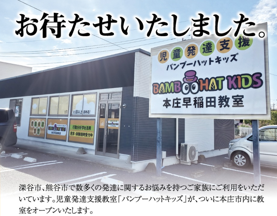 本庄市けや木に、0歳から就学前の発達や知的に遅れのあるお子様を科学的根拠に基づいた個別支援で、お子さまの成長を力強くサポートする児童発達支援教室「バンブーハットキッズ本庄早稲田教室」がオープンします😸