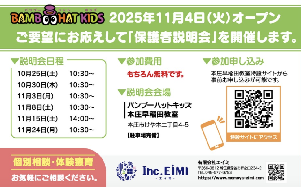 「バンブーハットキッズ本庄早稲田教室」ではオープン後も引き続き「保護者説明会」を開催いたしますので、是非お気軽にお問い合わせください📲