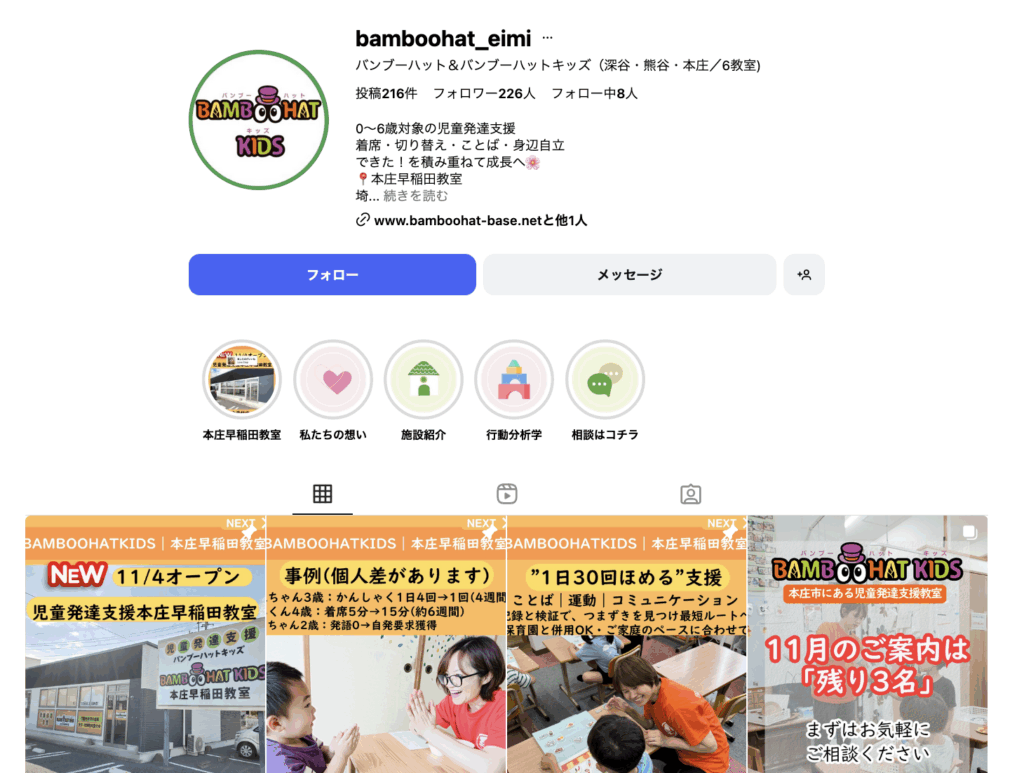 行動分析学(ABA)を用いて科学的根拠に基づいた児童発達支援を行う「児童発達支援教室(バンブーハットキッズ)」「放課後等デイサービス(バンブーハット)」などの施設を長年に渡り深谷、熊谷にて運営中。