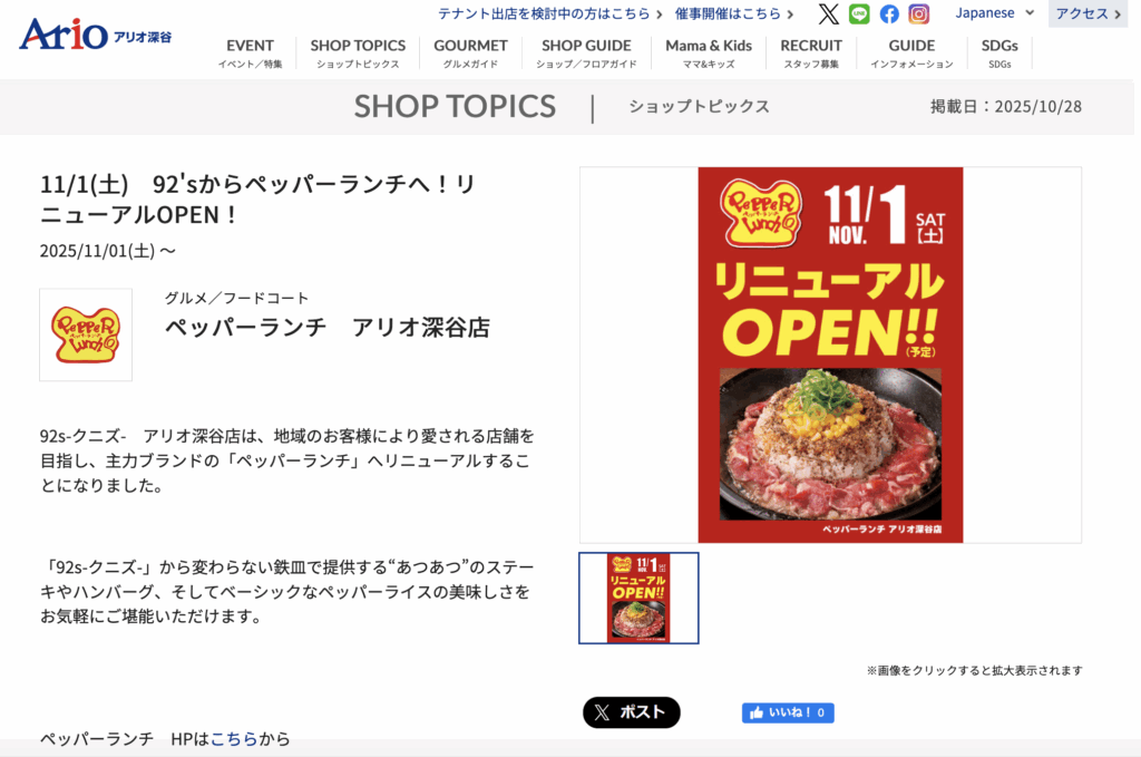 アリオ深谷のフードコートにある「92s-クニズ-アリオ深谷店」が「ペッパーランチ アリオ深谷店」にリニューアルしたみたいです。