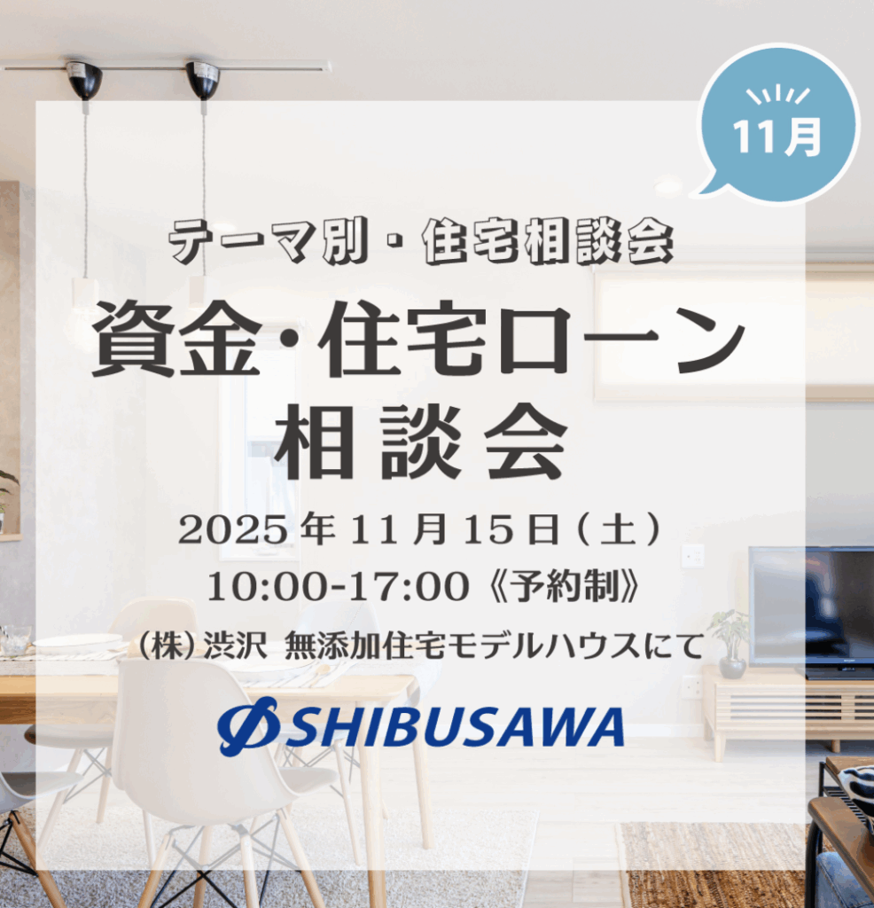深谷市上柴町東にある「 (株)渋沢 無添加住宅モデルハウス」でテーマ別住宅相談会〜資金・住宅ローン相談会〜が開催されます😸