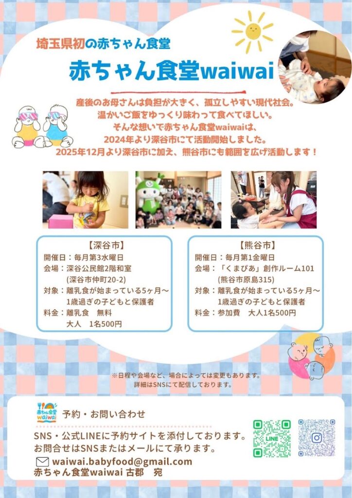 深谷市内で活動してきた「赤ちゃん食堂waiwai」が、2025年12月から熊谷市でも活動をスタートするみたいです✨