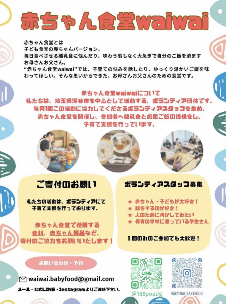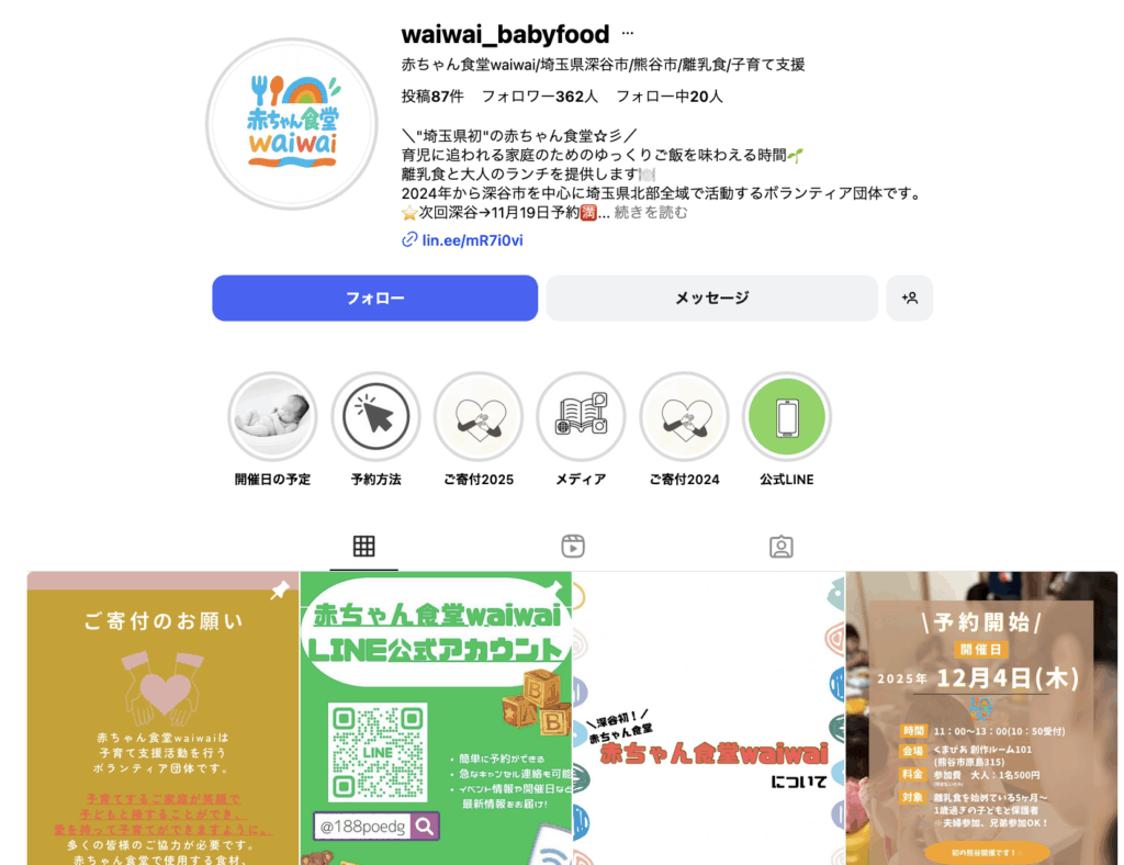 ちなみに12月4日に開催する熊谷市初の「赤ちゃん食堂waiwai」は、公式Instagramで開催告知後すぐに予約が満員になったとのこと💡