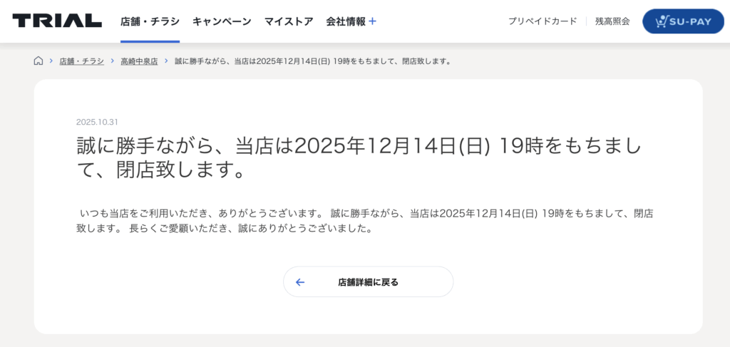 高崎市中泉町にある「トライアル 高崎中泉店」が閉店するみたいです。