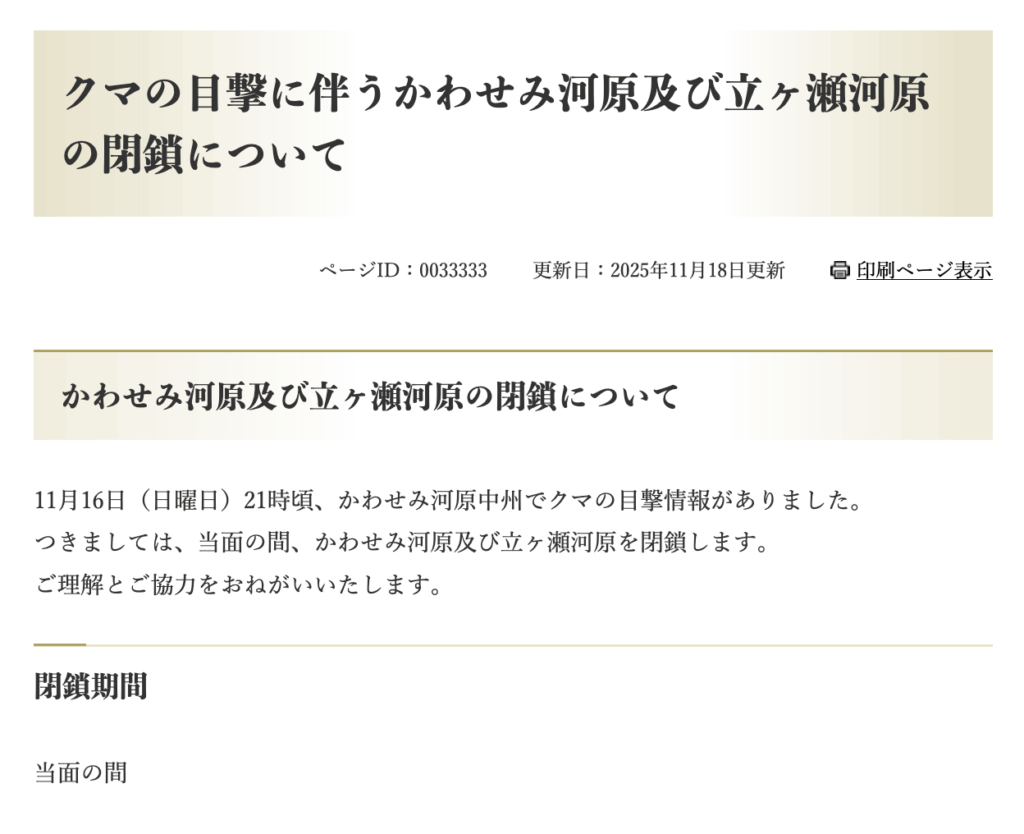 2025年11月16日(日)21時頃、かわせみ河原中州でクマの目撃情報があったそうです。