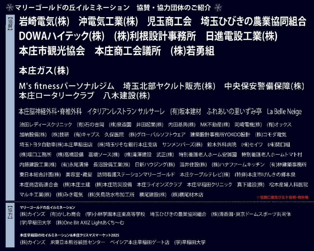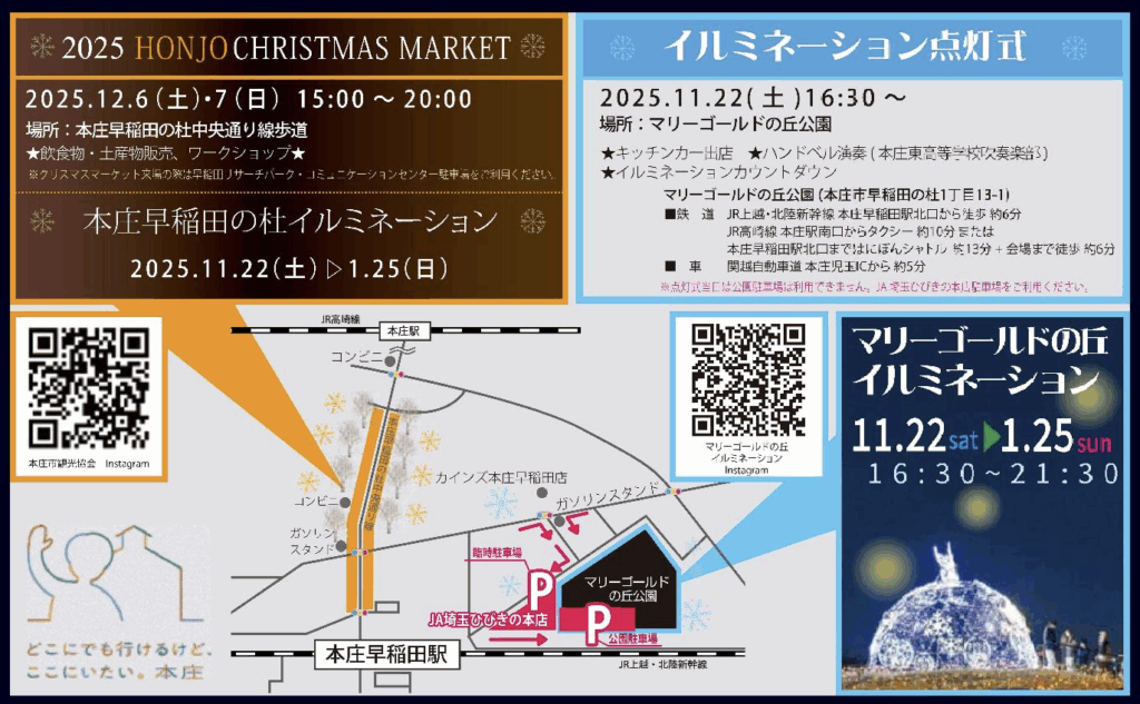 イルミネーション点灯式の他、「キッチンカーの出店」「本庄早稲田の杜イルミネーション」「2025 HONJO CHRISTMAS MARKET」などイベントが盛りだくさんのようです✨