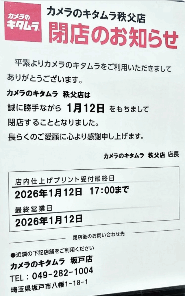 秩父市上野町にある「カメラのキタムラ秩父店」が閉店するそうです。