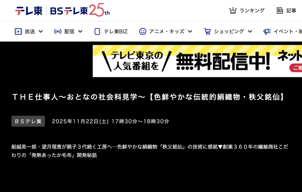2025年11月22日(土)BSテレ東で放送される「THE仕事人~おとなの社会科見学~」に秩父が映るみたいです。