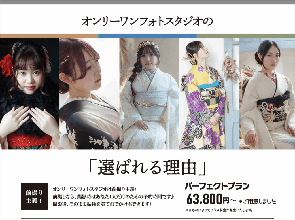 本庄市にある「オンリーワンフォトスタジオ」の『成人式前撮り写真』は、スタジオ撮影とロケーションフォトの二本立て✌️