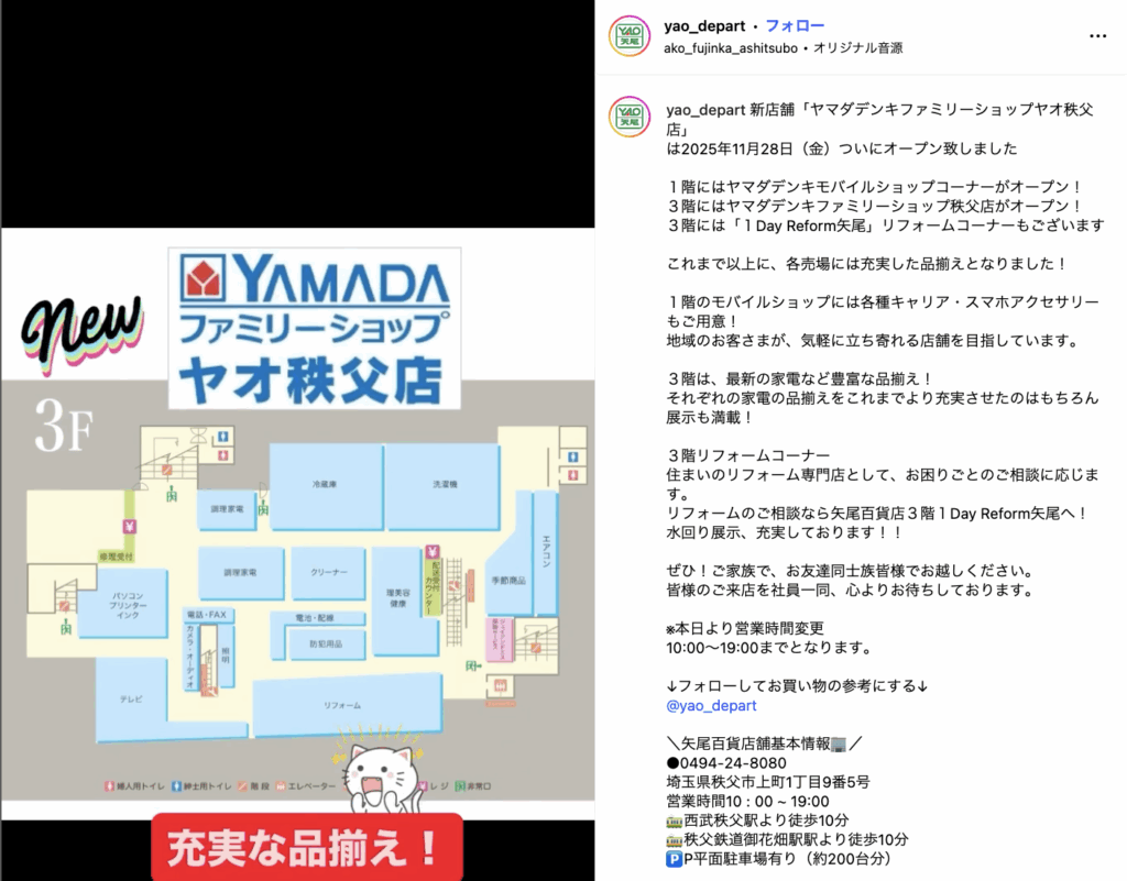 秩父市にある「矢尾百貨店」内に「ヤマダファミリーショップ ヤオ秩父店」がオープンしたみたいです。