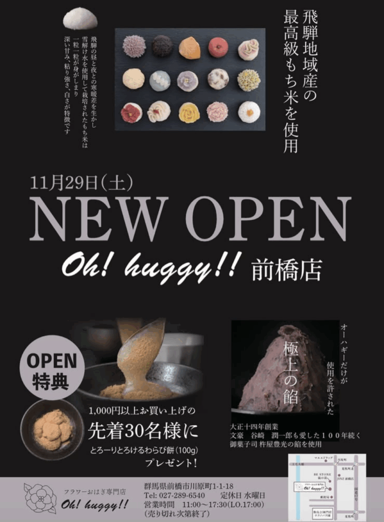 前橋市川原町にフラワーおはぎ専門店「Oh! huggy!! (オーハギー)前橋店」がオープンしたみたい。