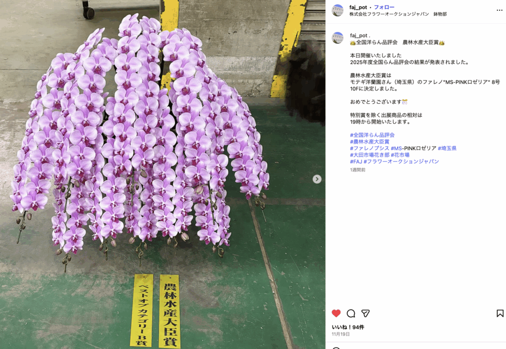 更に、2025年11月14日(金)〜16日(日)にイオンモール川口前川で開催された埼玉県下最大級の花のイベント「第42回さいたま花の祭典」でミディ胡蝶蘭「タイアン」が「農林水産大臣賞」を受賞しました!