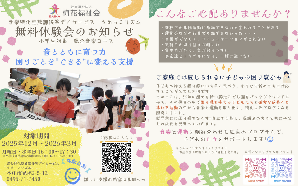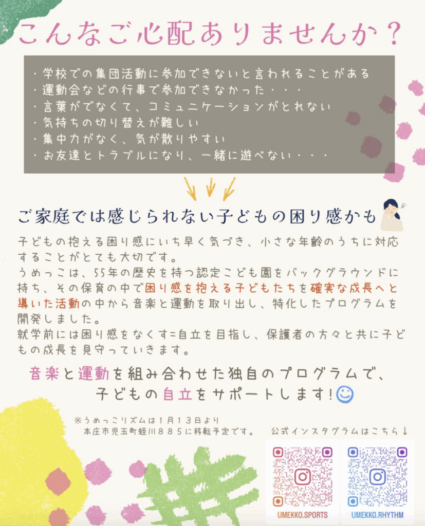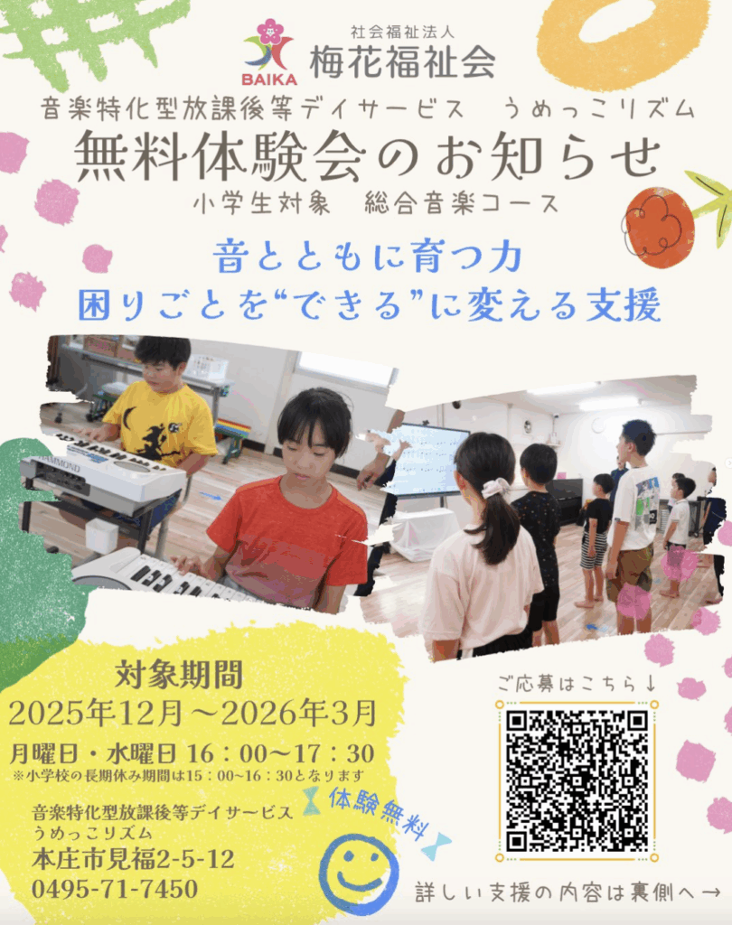 埼玉県本庄市見福にある「音楽特化型放課後等デイサービス うめっこリズム」が、そんなお悩みを抱えている保護者と大切なお子さんの未来をより明るくするきっかけを見つけていただくことを目的とした小学生対象の「療育プログラム体験会」を実施します!
