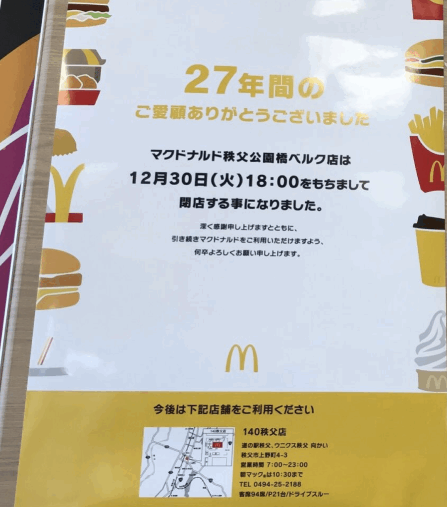 秩父市中村町にある「マクドナルド秩父公園橋ベルク店」が閉店するみたいです。
