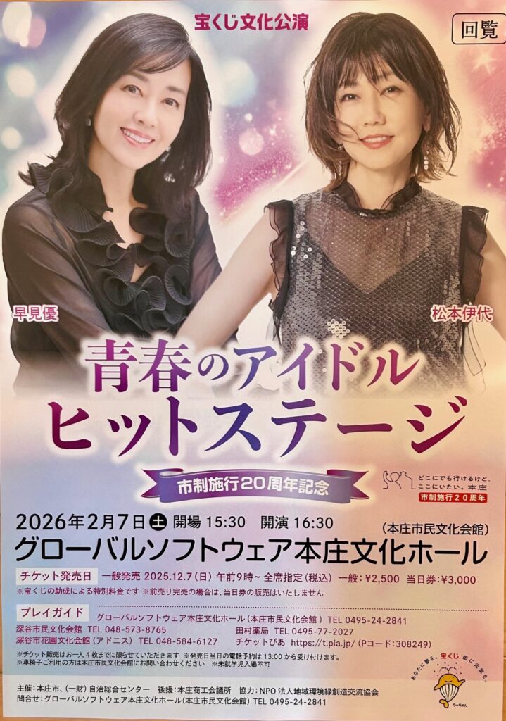 本庄市北堀にある「グローバルソフトウェア本庄文化ホール(本庄市民文化会館)」で松本伊代さんと早見優さんによる「宝くじ文化公演 青春のアイドルヒットステージ」が開催されるようです。