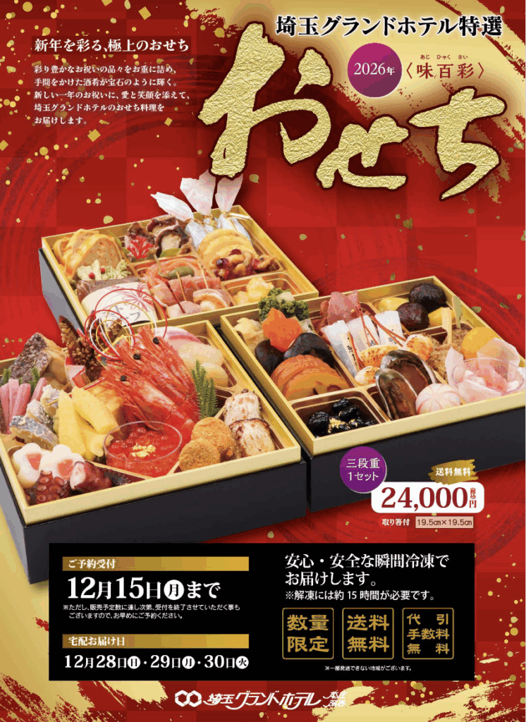 新しい一年のお祝いに、愛と笑顔を添えた「埼玉グランドホテル深谷」のおせち<味百彩(あじひゃくさい)>のご予約を受け付けております😸