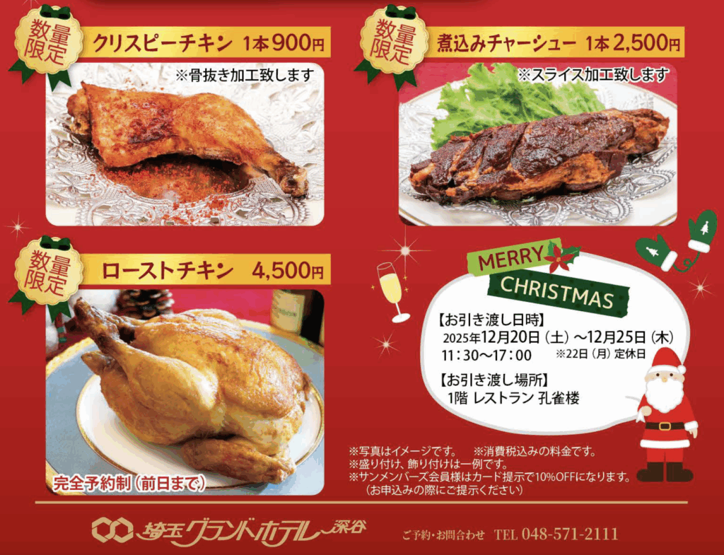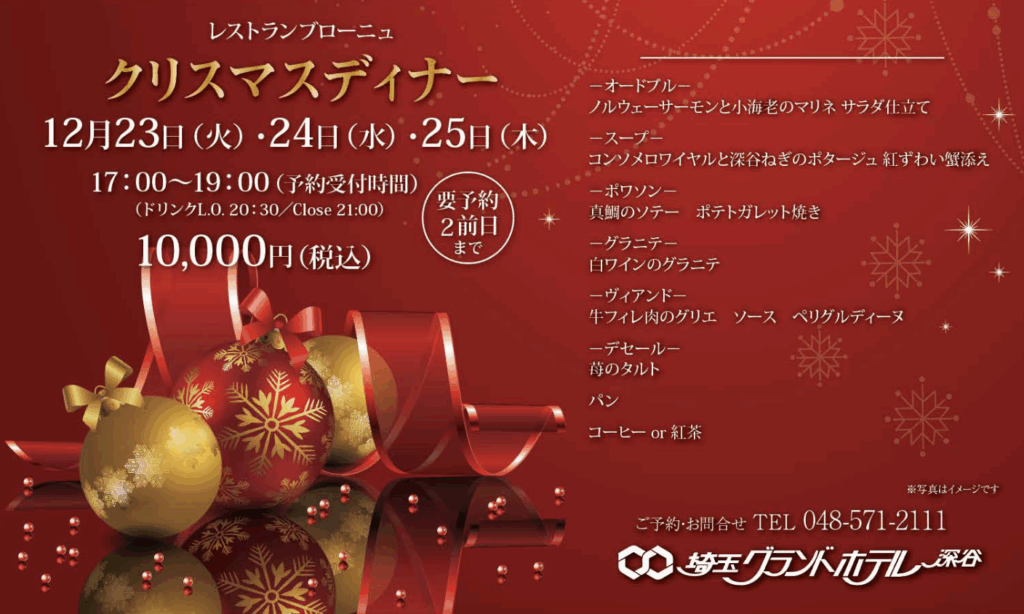 という事で今回は、「埼玉グランドホテル深谷」の「クリスマス」「お正月」「忘・新年会」メニューをご紹介します✌️