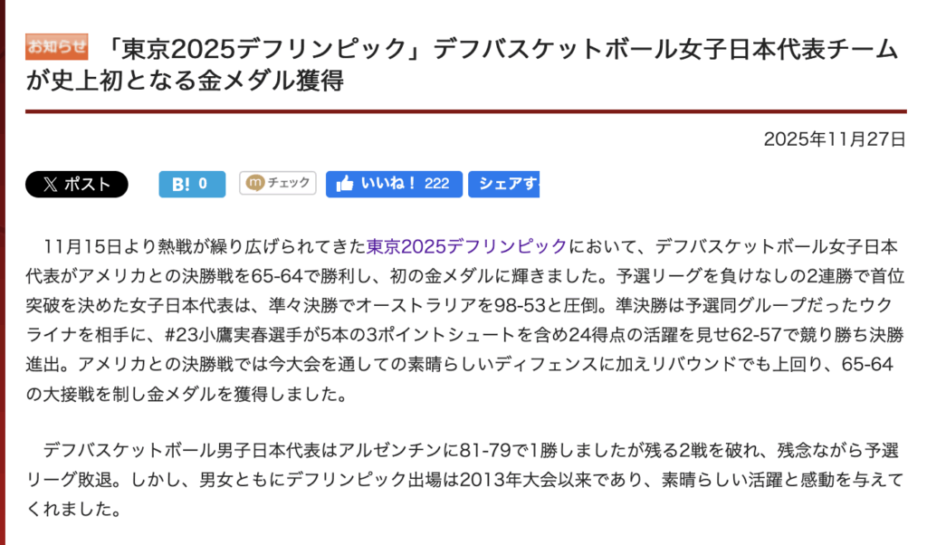 デフバスケットボール女子日本代表はアメリカとの決勝戦を65-64で勝利し、初の金メダルに輝きました🏆