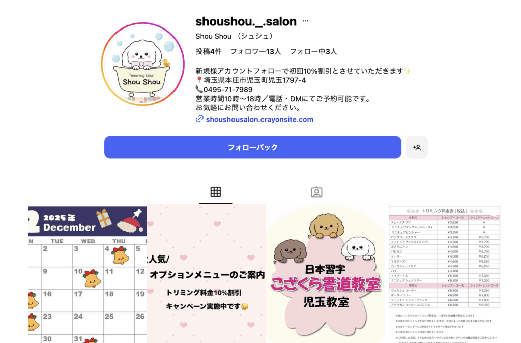 ※トリミング中は電話応対ができない場合がございますので、お問い合わせやご予約は「DM」からされることをおすすめします。