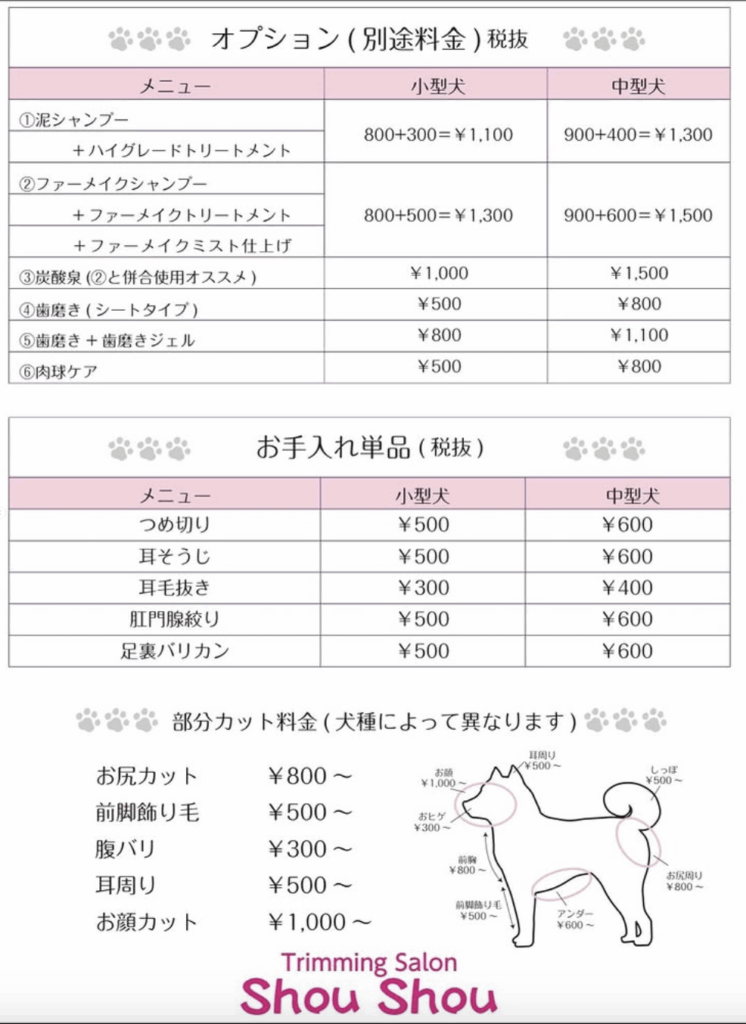 ※シャンプーコースとカットコースご利用の方は、お手入れ(爪切り、肛門腺、足裏バリカン、お耳掃除)は含まれています。