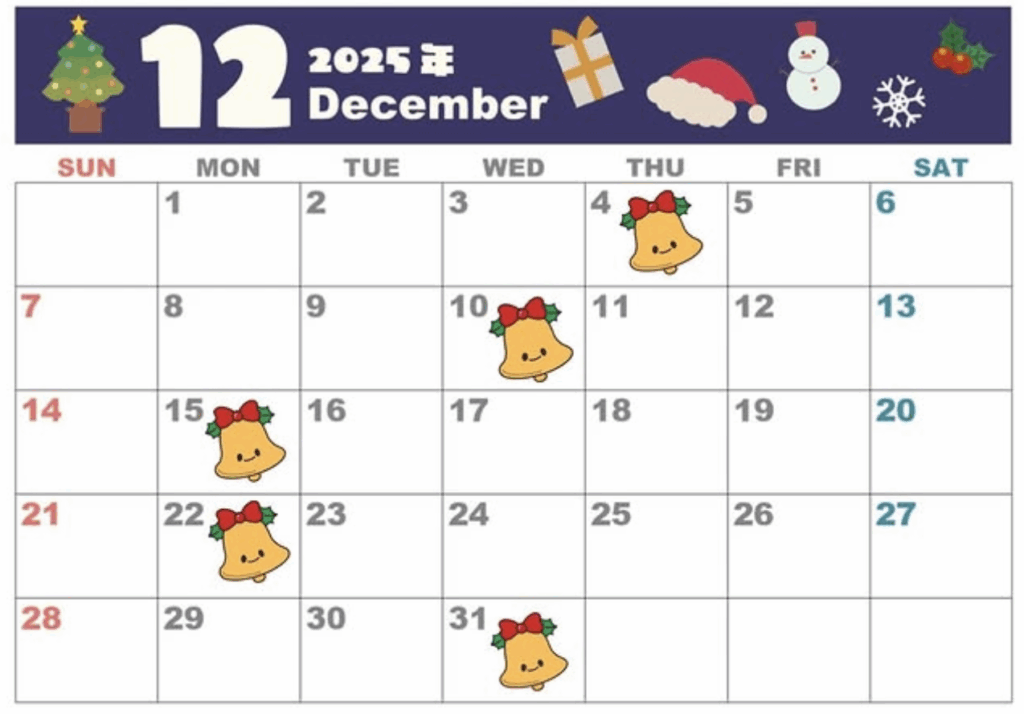 12月4日(木)・10日(水)・15日(月)・22日(月)・31日(水)